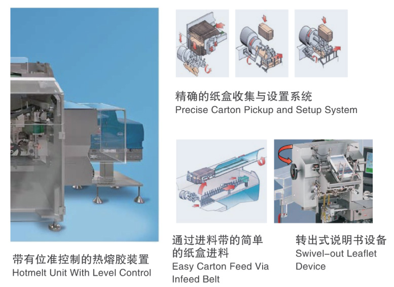 CM400高速智裝盒機(jī)是機(jī)電一體化的高科技產(chǎn)品,該機(jī)器的優(yōu)點(diǎn)在于:其陽(yáng)臺(tái)是設(shè)計(jì)具有符合藥品生產(chǎn)質(zhì)量管理規(guī)范的基本及其結(jié)構(gòu),并且其包裝部分與傳動(dòng)部分完全分個(gè)開來(lái)。主傳動(dòng)部分可改為伺服傳動(dòng)系統(tǒng),運(yùn)行更平穩(wěn),有效降低噪音,參數(shù)調(diào)節(jié)更健康。最高速度可達(dá)400盒/分鐘,適用于泡罩板、瓶子、安瓿瓶、軟膏等形狀的產(chǎn)品裝盒。CM400高速智裝盒機(jī)是機(jī)電一體化的高科技產(chǎn)品,該機(jī)器的優(yōu)點(diǎn)在于:其陽(yáng)臺(tái)是設(shè)計(jì)具有符合藥品生產(chǎn)質(zhì)量管理規(guī)范的基本及其結(jié)構(gòu),并且其包裝部分與傳動(dòng)部分完全分個(gè)開來(lái)。主傳動(dòng)部分可改為伺服傳動(dòng)系統(tǒng),運(yùn)行更平穩(wěn),有效降低噪音,參數(shù)調(diào)節(jié)更健康。最高速度可達(dá)400盒/分鐘,適用于泡罩板、瓶子、安瓿瓶、軟膏等形狀的產(chǎn)品裝盒。CM400高速智裝盒機(jī)是機(jī)電一體化的高科技產(chǎn)品,該機(jī)器的優(yōu)點(diǎn)在于:其陽(yáng)臺(tái)是設(shè)計(jì)具有符合藥品生產(chǎn)質(zhì)量管理規(guī)范的基本及其結(jié)構(gòu),并且其包裝部分與傳動(dòng)部分完全分個(gè)開來(lái)。主傳動(dòng)部分可改為伺服傳動(dòng)系統(tǒng),運(yùn)行更平穩(wěn),有效降低噪音,參數(shù)調(diào)節(jié)更健康。最高速度可達(dá)400盒/分鐘,適用于泡罩板、瓶子、安瓿瓶、軟膏等形狀的產(chǎn)品裝盒。CM400高速智裝盒機(jī)是機(jī)電一體化的高科技產(chǎn)品,該機(jī)器的優(yōu)點(diǎn)在于:其陽(yáng)臺(tái)是設(shè)計(jì)具有符合藥品生產(chǎn)質(zhì)量管理規(guī)范的基本及其結(jié)構(gòu),并且其包裝部分與傳動(dòng)部分完全分個(gè)開來(lái)。主傳動(dòng)部分可改為伺服傳動(dòng)系統(tǒng),運(yùn)行更平穩(wěn),有效降低噪音,參數(shù)調(diào)節(jié)更健康。最高速度可達(dá)400盒/分鐘,適用于泡罩板、瓶子、安瓿瓶、軟膏等形狀的產(chǎn)品裝盒。